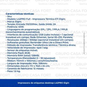 A elgin l42pro full é a solução perfeita para quem busca uma impressora de etiquetas versátil e fácil de usar. Com sua tecnologia de transferência térmica/térmica direta e resolução de 203dpi/300dpi opcional, é possível imprimir diversos tipos de etiquetas com qualidade e precisão, como gôndola, tag, couche, bopp, vinil, poliéster e térmicas, com gap, tarja preta ou contínuo, em diferentes formatos e tamanhos, como quadradas, retangulares e redondas, com várias colunas e muito mais.