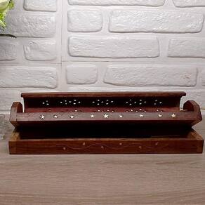 Porta Incenso e incensário de madeira com lindos detalhes talhado na madeira. Seu suporte serve para duas vareta de incenso ao mesmo tempo.Possui um guarda incenso na parte inferior.