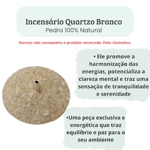 Transforme o seu espaço em um ambiente de tranquilidade e equilíbrio com o Incensário de Pedra Natural Quartzo Branco. Feito de quartzo puro, este incensário não apenas embeleza o seu lar, mas também potencializa as energias de cura e limpeza, criando uma atmosfera serena e energizante. Cada peça é única, com veios naturais e detalhes que refletem a beleza da natureza.