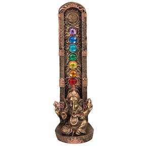 O incensário possui 7 pedras representando as cores de cada chakra, com o porta incenso na vertical e uma estátua Ganesha. Indicado para locais de medição, prática de yoga e decoração de ambientes internos em geral.