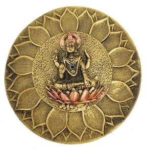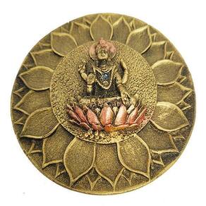Tem a representação da Deusa Lakshmi, a esposa do deus Vishnu e a personificação da prosperidade. Aqui ela esta sentada sobre uma flor de lótus, e segurando flores de lótus nas mãos, e um cântaro que jorra moedas de ouro. Possui local para apoiar o incenso e queimá-lo, assim deixando o ambiente com energias boas e uma decoração linda.