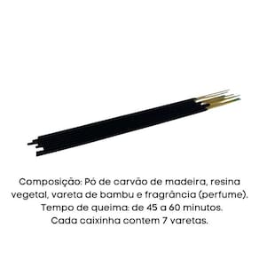 Detalhes técnico: Quantidade de 7 varetas Peso aproximado de 13 g Tempo de queima: de 40 minutos Origem: Índia Composição:pó de carvão de madeira, resina vegetal, vareta de bambu, fragrância perfume.