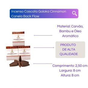 Incenso Cone Cascata Goloka Back Flow - Selecione o Aroma Cor: Cinnamon Canela Incenso Cone Cascata Goloka Back Flow - Selecione o Aromax000D Conteúdo da embalagem: uma caixinha com 10 incensos cones tradicional.x000d Fabricação em massala - origem: Índia.x000d x000d Escolha um Aroma disponíveis na opção COR do próprio anúncio.x000d x000d Caixinha contém 10 cones refluxox000D x000d Composição: carvão aglutinante, varetas de bambu, óleo aromático de sândalo e essências.x000d x000d Como usar: x000D Mantenha o incensário afastado de correntes de ar ou vento se não a fumaça não irá se movimentar corretamente.x000d Acenda a ponta do incenso goloka até ele ficar avermelhado em brasa e a fumaça sair por baixo do incenso.x000d Após isso coloque o incenso no incensário e ele queimará por até 20 minutos.x000d x000d Enviamos o seu produto em até 24 horas após a confirmação de pagamentox000D x000d Caso tenha alguma dúvida nos mande mensagem que respondemos rapidinho para te ajudar da melhor forma possível Marca: Bialluz