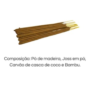 Como usar: Fixe o produto em um local seguro contra fogo e acenda a ponta coberta de massa. Composição: Pó de madeira, Joss em pó, Carvão de casca de coco e Bambu. Detalhes Técnicos: Peso Total da caixa: 520g Quantidade Total: 13 varetas em cada caixa, 156 no total. Produto Importado da Índia. Tempo de queima aproximadamente de cada vareta 60 min. Medidas da caixa: Comprimento: 24 cm Largura: 18,5 cm Altura: 7 cm
