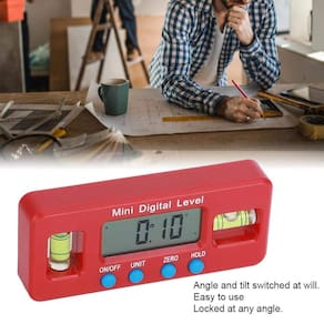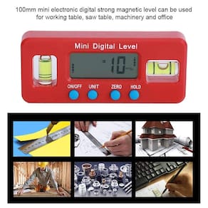 Especificação Material: ABS Cor: Vermelho Peso: 60g Tamanho do produto: 10x4,2x1,9 cm Lista de embalagem: 1 x Nível digital Características: 100% novo e de alta qualidade. Inclinômetro de nível digital: ideal para medição de ângulos na indústria automotiva, marcenaria, construção civil, maquinário, construção civil e assim por diante. Fácil de ler: com um grande display LCD, geralmente você pode ler os dados com clareza. Tela de rotação automática e função de bloqueio: gire a tela para ver o ângulo em qualquer direção, o valor sempre mostra o lado direito para cima, esteja a unidade de cabeça para baixo ou não. Base magnética: ímãs poderosos embutidos podem ser conectados à superfície do ferro para medir. Alta precisão com bolhas de nível duplo: a faixa de medição de 4* 90° (0-360°) é a precisão de ± 0,3°, resolução de 0,1 grau, fornece um ângulo exato. Calibração rápida com o botão de calibração, os valores podem ser lidos claramente no display LCD. Desligamento automático. 4 modos de medição: medida em ângulo, inclinômetro, pol/ft, mm/m. Especificação: Material: ABS Cor do item: vermelho Tamanho: 100x42x 19 mm (LxWxT) Bateria: células de botão de 2x3V (incluídas) Faixa de medição: 4 x 90° Resolução: 0,1° Umidade relativa: 40% -80% Quantidade de bolhas: 2 bolhas (Nota: permita um erro de 1-3 mm devido ao manual medição e ligeira diferença de cor causada pela luz e pela tela.) O pacote inclui: 1 unidade x nível digitalAlta precisão: oferece uma resolução de 0,1° com uma precisão de ± 0,3°. Base magnética: equipada com ímãs fortes para fácil fixação em superfícies metálicas. Grande tela LCD: tela de fácil leitura que gira para qualquer ângulo de visão. Vários modos de medição: suporta conversões de ângulo, inclinômetro e unidade. Desligamento automático: economiza a vida útil da bateria com uma função de desligamento automático.