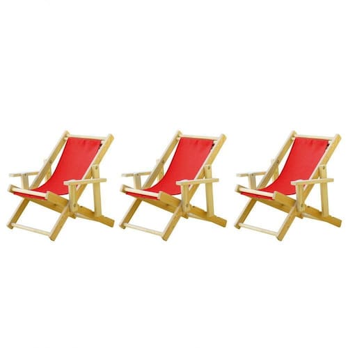 Infantil Kit 3 Cadeira Espreguiçadeira Dobrável-vermelho 3 ESPREGUIÇADEIRAS C/B INFANTILSabe aquele final de tarde que você tanto espera para tirar um descanso merecido? Ou aquela viagem para a praia programada a meses com a família? Pois é, nossas cadeiras espreguiçadeira serve exatamente para esses momentos, com várias opções de cores, os tecidos além de charmosos são hidro-repelentes e se adequam a qualquer ambiente, facilmente removíveis para higienização.Estrutura 100% de madeira maciça de ótima qualidade, a espreguiçadeira é totalmente dobrável e reclinável (4 posições de ângulo), com descanso para braço, sendo possível montar invertida sem o encosto de braço, perfeita para seu lazer em todos os ambientes, esse é o item que definitivamente não pode faltar na vida de quem de fato, quer aproveitar bons momentos! Medidas Cadeira Espreguiçadeira Infantil:Altura 1: 74,5 cm;Altura 2: 64 cm;Altura 3: 51 cm;Profundidade: 66 cm.Dimensão aproximada total:Comprimento: 64 cm;Largura: 56 cm;03 Níveis de Regulagem de Altura;Tecido Reforçado;Fabricada em Madeira Maciça Pinus;Peso aproximado: 5,5 Kg;Suporta aproximadamente 70 kg;Cor da Madeira: ;Informações Adicionais:Garantia: 90 dias contra defeitos de fabricação.Acompanha 2 cadeiras Obs. A cor pode variar da foto conforme a tonalidade da madeira e iluminação.. !!