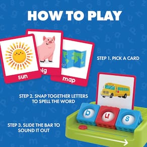 - Atividades ortográficas: a tampa da embalagem funciona como um quadro de atividade ortográfica para que as crianças possam praticar ortografia e construção de palavras; use a barra deslizante para praticar a combinação de sons de letras; use os cartões de palavras consoantes-vogais e consoantes para orientar o aprendizado