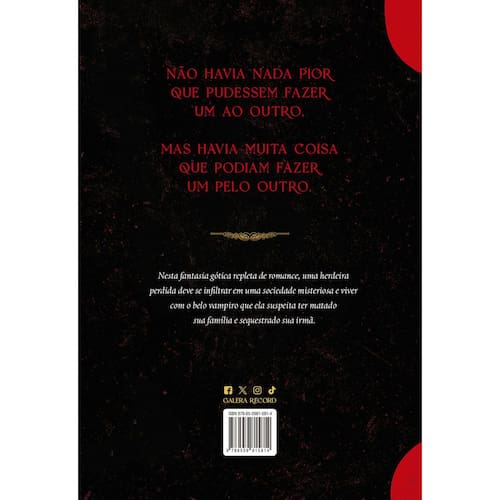 Uma herdeira perdida deve se infiltrar numa sociedade misteriosa e viver com o vampiro que ela suspeita ter matado sua família e sequestrado sua irmã. Inimigo imortal é uma fantasia best-seller gótica repleta de romance. Kidan Adane é uma órfã que cresceu longe da sociedade arcana em que nasceu, na qual linhagens humanas adquirem poderes ao se tornarem parceiras de vampiros. Mas, quando a irmã de Kidan, June, desaparece, a garota se convence de que o responsável foi um vampiro, justamente aquele que está vinculado a sua própria família: o cruel, mas sedutor, Susenyos Sagad. Para encontrar June, Kidan precisa se infiltrar na elite da Universidade Uxlay, onde humanos e vampiros são enviados para estudar juntos e garantir a coexistência pacífica entre as espécies, assim como herdar o legado das famílias de que fazem parte. Porém, sendo a última Adane que sobrou, para permanecer na universidade, Kidan precisa morar na casa que sua família deixou para trás há tantos anos. Dividir o espaço com Susenyos realmente não fazia parte dos planos de Kidan, e muito menos dos dele... O vampiro fará de tudo para tirá-la da casa e conseguir herdar ele mesmo o direito à propriedade. Mas ela não desistirá assim tão fácil, ainda que Susenyos desperte o que há de pior nela, e que a casa alimente seus piores pesadelos. Cada vez mais envolvida no implacável submundo vampiresco, Kidan colocará em risco a própria vida — além da sua humanidade — para encontrar a irmã, que parece estar no centro de uma ameaça centenária. Para salvá-la, Kidan precisará se libertar dos horrores das próprias ações ou se envolver em um amor sombrio — um que exigirá sangue. Perfeito para fãs de: Inimigos que se apaixonam Romantasia Vampiros Casas sencientes Personagens de caráter duvidoso Dark Academia “Totalmente irresistível. Inimigo imortal pega as melhores partes do folclore vampírico e apresenta uma inimizade imortal e violenta. Tigest Girma conduz a fantasia de moral cinza exatamente para onde ela deve ir, e você não conseguirá piscar.” – Chloe Gong, autora de Prazeres Violentos, best-seller nº 1 do New York Times. “Uma história deliciosamente sombria repleta de personagens de moral cinza pelos quais é impossível não torcer.” – Gabi Burton, autora do best-seller O canto da sereia. “Uma estreia feroz de uma nova voz inovadora.” – Kamilah Cole, autora de Fogo neles “Um retorno ao envolvente gênero dos vampiros que se deleita com prazeres violentos e sangrentos.” – Kirkus Reviews “A autora estreante, Tigest Girma, atrai os leitores com a promessa de romances sombrios e perigosos, e então os enreda com personagens de moral cinza e bem desenvolvidos.” – Publishers Weekly