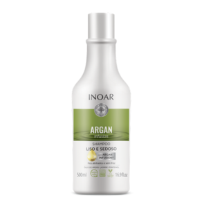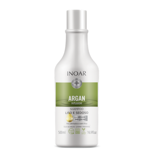 Inoar Argan Infusion Liso e Sedoso Shampoo 500ml Shampoo Inoar Argan Infusion Liso e Sedoso, perfeito para quem quer os fios mais comportados, com toque macio e sem os fios arrepiados. Efeito mais alinhado e elimina o frizz. Usa o óleo de argan e mais ativos nutritivos para revitalizar e umectar os fios. Fecham as cutículas para eliminar o frizz e conseguir um efeito mais sedoso, com menos volume, e mais liso. Não testado em animais. Produto vegano. Como Usar: Shampoo (low poo): Aplique uma pequena quantidade do shampoo e aplique no couro cabeludo molhado. Massageie com a ponta dos dedos até fazer espuma. Se sentir necessidade, repita a operação.