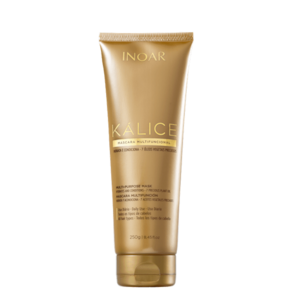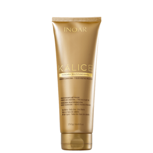 Inoar Kálice Máscara Multifuncional 250ml Máscara multifuncional para todos os tipos de cabelo. Inoar Kálice trata e condiciona para um cabelo brilhante e macio. Inoar Kálice tem uma fórmula enriquecida com 7 óleos vegetais preciosos para o cabelo que regenera os fios e proporciona nutrição e hidratação. Pode ser usada como máscara de tratamento ou como condicionador diário para um cabelo sempre brilhante, macio e cheios de vida. Ação: Óleos Vegetais Preciosos: contém Argan, Mirra, Macadâmia, Ojon, Amêndoas Doces, Jasmim e Alecrim que possuem ação emoliente, antioxidante, nutritiva e suavizante. Conselho de Aplicação: Após lavar os cabelos, aplique a máscara multifuncional Kálice nos fios úmidos, massageando. Faça uma pausa de 2 a 5 minutos, enxágue e finalize como desejar.