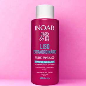 Conteúdo da embalagem: 01(um) Inoar Liso Extraordinário Shampoo alinhador 500ml O Shampoo Liso Extraordinário faz parte de um tratamento completo que garante fios lisos, alinhados e protegidos contra a umidade por até 10 dias. Sua fórmula de alta performance, enriquecida com AHA, Queratina Vegetal e Niacinamida, limpa suavemente sem ressecar, enquanto atua na reparação da fibra capilar, selagem das cutículas e controle imediato do frizz.Resultado: cabelos limpos, lisos, macios e luminosos, com movimento natural e brilho espelhado, prontos para receber os demais tratamentos da linha.Sobre a empresa