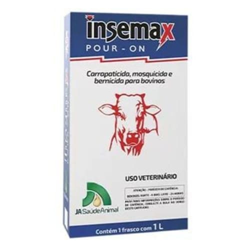 Insemax Pour-On - 1 litro Insemax é um ectoparasiticida à base de Cipermetrina, Clorpirifós e Butóxido de Piperonila que age no combate de parasitas externos, como: carrapatos, moscas e berne. É uma associação de Organofosforado, Piretróide de última geração e uma Piretrina, que aliados conferem melhor ação contra os ectoparasitas, além de baixo período de carência para leite e corte, permitindo utilização com segurança em bovinos.
