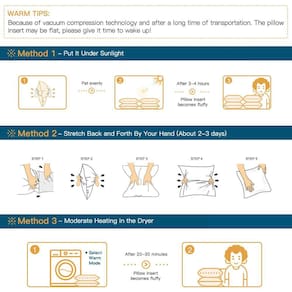 Dicas quentes: O inserto de almofada é embalado em compressão a vácuo. Depois de abrir a embalagem, siga os três métodos nas instruções para deixar o travesseiro macio. Isso criará um maravilhoso tempo de descanso para você.