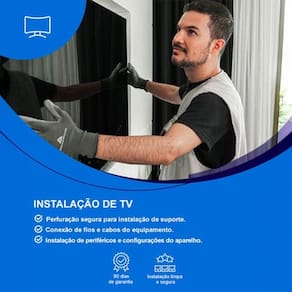 Serviço de instalação de TV com a visita de um ou mais técnicos especializados para instalar o equipamento na residência, fornecimento de suporte fixo universal para fixação da TV e 120 dias de suporte remoto por telefone.