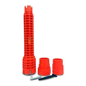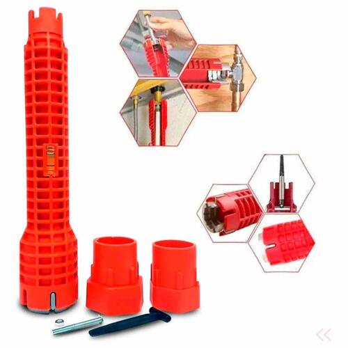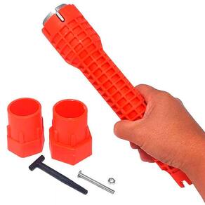 Ferramenta de encanamento universal, adequado para 99% porcas de torneira. É uma ferramenta muito útil para trabalhos em pias e encanamentos, pois ela permite que sejam aplicados níveis de torque mais elevados do que seriam possíveis com uma chave convencional, o que pode facilitar muito a tarefa de desmontar ou apertar peças. Uma chave hidráulica pode ser muito útil para remover e instalar um sifão novo, instalação de novas tubulações e Aperto de conexões. chave. 3 cabeça de chave substituível, 2 parafusos de fixação, extrator de parafuso longo, slot aberto permite fácil acesso às linhas de abastecimento existentes, como torneiras, pia, tubos de aquecedor de água, bacias de água.