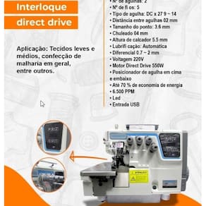 Motor Direct-Drive Embutido, 2 agulhas e 5 fios, operação silenciosa, alta durabilidade, economia de energia, painel digital com ajuste de velocidade e posicionamento automático da agulha, iluminação LED integrada, sistema de lubrificação automática, barra de agulha vedada.Funções