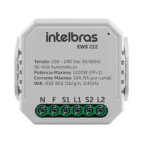 Descricao O Interruptor Intelbras EWS 222 permite que voce acione, controle e automatize remotamente equipamentos eletricos atraves do aplicativo Izy Smart, de maneira facil e entrada para dois interruptores, transforma interruptor comum em interruptor inteligente, para que possam ser realizadas automacoes residenciais e cenarios. Ou seja, voce ganha em praticidade e torna seu dia a dia muito mais moderno!Caracteristicas:- Wi-Fi - Smart- Duas entradas para interruptor- Aciona a iluminacao de ate dois cenarios diferentes, simultaneamente, via app ou comando de voz, sem perder a funcionalidade do interruptor- Controle compartilhado: cadastre ate 10 usuarios no aplicativo Izy e utilize o dispositivo com sua familia- Sistemas compativeis: IOS ( ou superior) / ( ou superior)- de instalacao: ideal para embutir em caixa 42 ou caixa de teto- Bitola maxima de fio: 1,5mm- Corrente maxima: 10A (FP=1)- Frequencia da rede eletrica: 50/60Hz- Potencia maxima de carga: Consumo de energia maximo: 1,2W- Temperatura de operacao: 0 a 40- Distancia maxima: 15 a 20m, com visada direta ao roteador- Material plastico: protecao anti-chama- Dimensoes: 50,5 x 46 x 19mm*Imagens meramente ilustrativas.Especificacao Tecnica Tensao/Voltagem: BivoltConteudo da embalagem:1 Interruptor Intelbras EWS 222 Cor: Branco