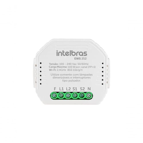 Descrição: Ajuste a intensidade da luz de até dois ambientes com o minicontrolador dimmer smart EWS 252. O dispositivo permite o controle da iluminação através do app Izy Smart, por assistente de voz e também por meio de interruptor de tecla física do tipo pulsador. Ele pode ser instalado de forma discreta embutido na caixa 42? do interruptor de luz. Através da conexão Wi-Fi à internet é possível deixar seu ambiente inteligente e automatizado através de agendamentos e programações de acionamento feitas pelo aplicativo, com possibilidade de integrar com outros dispositivos inteligentes da linha Izy como sensores, câmeras e fechaduras. Ajuste da intensidade da luz com o minicontrolador Regule a intensidade da luz de até dois ambientes pelo interruptor, aplicativo ou assistente de voz. Características técnicas Tensão de alimentação: 100 ~ 240 Vac (bivolt automático) 50/60 Hz Potência máxima de carga: 100 W (FP = 1) por canal Consumo: 1,2 W Número de canais: 2 Conexão elétrica: Fase (F), Neutro (N), Carga 1 (L1), Interruptor 1 (S1), Carga 2 (L2), Interruptor 2 (S2) (as cargas devem ser lâmpadas dimerizáveis, os interruptores devem ser do tipo pulsador) Bitola máxima de fio: 1,5 mm Conectividade: Wi-Fi IEEE 802.11b/g/n 2,4 GHz + Bluetooth 4.2 Wi-Fi - distância máxima do roteador: 15 a 20 m sem obstáculos App Izy Smart ? sistemas compatíveis:: iOS 9.0 ou superior, Android 4.4 ou superior Material: plástico com proteção antichama Local de instalação: ideal para embutir em caixa 42?, acompanha suporte para instalação em trilho DIN (não indicado para instalação dentro de quadro metálicos). Temperatura de operação: 0 a 40 C Garantia 1 ano Freqência de operação 50/60 Hz Modelo do produto EWS 252 Cor Branco Quantidade pacote 01 Comprimento do produto 1,9 cm Largura do produto 5,3 cm Altura do produto 1,9 cm Peso do produto 0,05 kg Conteúdo da embalagem 01 x minicontrolador 01 x suporte de fixação 01 x guia rápido...