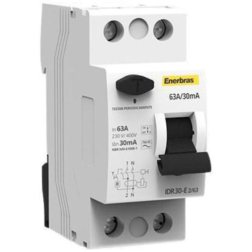 diferencial residual bipolar 63a/30ma - enerbras idr30-e2/63 Anuncio contém: 1. diferencial residual bipolar 63a/30ma - enerbras idr30-e2/63 Detalhes do produto : O diferencial-residual idr tem como função principal proteger as pessoas e animais contra choques elétricos e o patrimônio contra incêndios originados de falhas na instalação elétrica. O uso do idr é exigido pela norma brasileira de instalações elétricas nbr 5410 para a proteção de circuitos elétricos de ambientes predominante-mente frios e úmidos, tais como: 1. Circuitos de chuveiros, torneiras e aquecedores de passagem elétricos, além de pontos de alimentação elétrica para banheira de hidromassagem. 2. Circuitos que alimentam tomadas situadas em áreas externas a edificação. 3. Circuitos que alimentam tomadas situadas em áreas internas que possam vir a alimentar equipamentos na área externa. 4. Circuitos que sirvam a pontos de utilização situados em cozinhas, copas, lavanderias, áreas de serviço, garagens e demais dependências internas normalmente molhadas ou sujeitas a lavagens. Marca: Não Informado