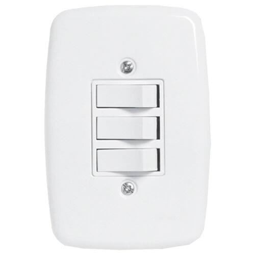 Informações Adicionais do Produto: Material: Placa e tecla em Abs, corpo em poliestireno. Contatos em latão. Tipo de ligação: 2 simples e 1 paralela Dimensões (Altura X Largura X Comprimento): 12,5 cm X 8,5 cm X 3 cm Peso do produto: 0,05210 Kg Corrente: 10A Tensão em V: 250V~ Peso embalado: 0,05450 Kg Altura embalagem: 18,00 cm Largura embalagem: 12,00 cm