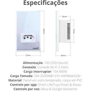 Interruptor Inteligente 1 Botão Touch C\ Tomada 20A Wi-Fi Branco Google Home e Alexa EKAT-T218-1WB