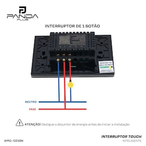 Especificações Técnicas: • Modelo: AMG-S01 (1 botão) • Tensão de trabalho: 110-240V (Bivolt automático) • Corrente máxima: 10A (resistiva) / 2,5A (indutiva ou capacitiva) • Conectividade Wi-Fi: 2.4GHz (não compatível com redes 5GHz) • Dimensões: 35x72x118mm (Caixa Padrão 4x2) • Instalação interna (uso residencial/comercial) • App compatível: Panda Plus, Tuya e Smart Life • Cores Disponíveis: Branco ou Preto ___________________________________________________________________________________________________________________________________