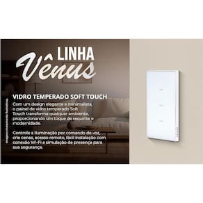 Inteligente Vênus Wifi 3 Botões Ekaza Branco 4x2 Inteligente Vênus Wi-fi 3 Botões Branco Ekaza Controle seu ambiente com praticidade e sofisticação O Inteligente Vênus Wi-fi 3 Botões Ekaza proporciona um controle inteligente e moderno para a iluminação de sua casa. Com a tecnologia Wi-fi, você pode acionar as luzes através do toque suave em seus três botões. Além disso, a compatibilidade com assistentes virtuais como Google Assistente e Amazon Alexa garante ainda mais conveniência no dia a dia. Diferenciais: Design elegante com acabamento em vidro soft touch Conexão Wi-fi que permite controlar os ambientes remotamente Compatível com assistentes virtuais para maior facilidade de uso Funcionalidade de 3 botões para acionamento de múltiplas lâmpadas ou cenários de iluminação Mais sobre o Produto: Controle por aplicativo de smartphone Programação de horários para acendimento automático Integração com dispositivos de automação residencial Compatibilidade com caixinhas de 4x2 polegadas Dicas de uso: Instale o Inteligente Vênus em seu ambiente desejado Conecte o dispositivo à rede Wi-fi Baixe o aplicativo correspondente para configuração Associe o aos assistentes virtuais para comandos de voz Ficha Técnica: Marca: Ekaza Modelo: Vênus Conectividade: Wi-fi Botões: 3 Cor: Branco Compatibilidade: Google Assistente, Amazon Alexa Dimensões: 4x2 polegadas Aplicativos: JWCOM, Ekaza, Android, Tuya, Smart Life e NovaDigital. : 12 meses contra defeitos de fabricação da Ekaza. Observação: é importante ter uma rede Wi-Fi 2,4GHz com boa capacidade para gerenciar os dispositivos de forma eficaz. Instabilidades na conexão podem interferir na resposta aos comandos via aplicativo e assistentes de voz, e na execução de rotinas automáticas. Recomenda-se consultar um técnico da operadora para garantir uma conexão estável.