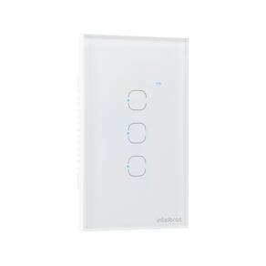 Características técnicas Tensão de alimentação: 100 a 240 V (bivolt automático) 50/60 Hz Potência máxima da carga (FP=1): 1.100 W em 110 V e 2.200 W em 220 V Corrente máxima: 10 A (FP = 1) Consumo de energia máximo (interruptor): 1,2 W Número de teclas touch: 3 Quantidade de saídas (canais): 3 Local de instalação: Caixa 4??2??? para interruptor Bitola máxima de fio: 1,5 mm² Conexão: Zigbee 3.0 IEEE 802.15.4, Bluetooth 4.2 Materiais Vidro temperado 4 mm, plástico com proteção anti-chama e anti-UV Dimensão do produto (L ?? A ?? P) 72 ?? 118 ?? 39 mm Garantia 1 ano Cor Branco Comprimento do produto 3,9 cm Largura do produto 7,2 cm Altura do produto 11,8 cm Peso do produto 0,165 g Conteúdo da embalagem 01 x interruptor 01 x manual de usuário