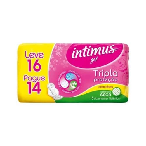 Intimus Absorventes íntimos Gel Seca C/a C/16 DESCRIÇÃO: O Intimus Gel Seca tem cobertura com furinhos em forma arredondada por onde passa o fluxo rapidamente e não volta, deixando você muito mais seca e limpa.AÇÃO/ATIVOS: Absorção em segundos: O sistema centro azul aliado as redes de canais absorvem o fluxo rapidamente e distribuem por todo o absorvente evitando vazamentos. Extratos naturais de camomila e Aloe Vera que ajudam a cuidar da pele e prevenir possíveis irritações. Você sempre livre, seca e protegida.MODO DE USAR: Após retirar a proteção do absorvente, encaixe-o na calcinha e a vista.ESTE ANÚNCIO CONTÉM: 01 Intimus Absorventes Íntimos Gel Seca C/A C/16Intimus Absorventes Ãntimos Gel Seca C/a C/16
