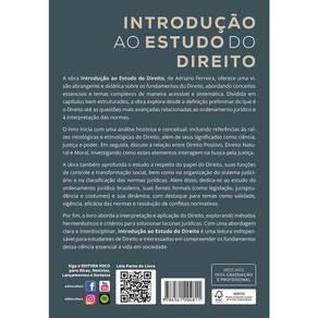 Sobre a obra Introdução ao Estudo do Direito - IED - 2ª Ed - 2025 A obra Introdução ao Estudo do Direito , de Adriano Ferreira , oferece uma visão abrangente e didática sobre os fundamentos do direito, abordando conceitos essenciais e temas complexos de maneira acessível e sistemática. Dividida em capítulos bem estruturados, a obra explora desde a definição preliminar do que é o direito até as questões mais avançadas relacionadas ao ordenamento jurídico e à interpretação das normas. O livro inicia com uma análise histórica e conceitual , incluindo referências às raízes mitológicas e etimológicas do direito, além de seus significados como ciência, justiça e poder. Em seguida, discute a relação entre direito positivo, direito natural e moral, investigando como esses elementos interagem na busca pela justiça. A obra também aprofunda o estudo a respeito do papel do Direito , suas funções de controle e transformação social, bem como na organização do sistema judiciário e na classificação das normas jurídicas. Além disso, dedica-se ao estudo do ordenamento jurídico brasileiro, suas fontes formais (como legislação, jurisprudência e costumes) e sua dinâmica, com destaque para temas como validade, vigência, eficácia das normas e resolução de conflitos normativos. Por fim, o livro aborda a interpretação e aplicação do direito , explorando métodos hermenêuticos e critérios para solucionar lacunas jurídicas. Com uma abordagem clara e interdisciplinar, Introdução ao Estudo do Direito é uma leitura indispensável para estudantes de direito e interessados em compreender os fundamentos dessa ciência essencial à vida em sociedade.