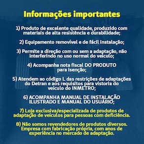 Acelerador à esquerda/ Inversão de Pedal O acelerador à esquerda ou inversão de pedal é um equipamento de adaptação Veicular para deficientes físicos, que transfere o comando do acelerador para o lado Esquerdo. A adaptação permite a direção do veículo com ou sem a mesma, através do recurso Escamoteável que pode ser elevado quando não utilizado, mantendo a originalidade Do pedal, sem interferências ou vestígios de sua utilização. Sendo um equipamento de segurança, possibilita que o motorista possa frear ou Acelerar o veículo utilizando somente o pé esquerdo. É indicado para condutores que Possuem limitações ou deficiências no membro inferior ou em todo hemicorpo direito. Para voltar a utilizar o pedal basta acioná-lo com o pé, deixando o equipamento na Posição adequada. Se adapta somente em veículos com câmbio automático e pode Ser instalado pelo seu mecânico de confiança. Informações Gerais: Equipamento específico para cada modelo de carro Consulte todos os anúncios ; Fácil instalação, não necessitando de mão de obra especializada; É recomendado para condutores com limitações ou deficiências nos membros Inferiores ou no hemicorpo direito; Destina-se a veículos com câmbio automático; Atende ao código C das restrições de adaptações do Detran; Equipamento nacional; Não deixa vestígios e/ou danos na instalação ou retirada da adaptação, pois utiliza a Furação do veículo; Equipamento com pedal escamoteável pode ser ocultado, quando não estiver em uso ; Design ergonômico e discreto; Projeto exclusivo e desenvolvido com materiais de alta durabilidade e resistência; Vantagem exclusiva: único do mercado com 3 anos de , contra defeitos de fabricação; Acompanha instruções de instalação e suporte telefônico ou WhatsApp, caso seja necessário; Inclusa para isenção; O comprador é responsável pela instalação do equipamento; Valor somente do produto. Não abrange custos referentes a documentações do Detran e Inspeção junto à órgãos credenciados do INMETRO. Características E Especificações: Marca: AdapterPro; Material: Aço; Tamanho do equipamento: L 30 X A 11 X C 40 cm Peso: 1,500 kg : 03 anos de . Acompanha de compra do equipamento; Não inclusos no valor taxas e demais despesas de documentação e instalação. Marca: Não Informado Ean: 7890000928564