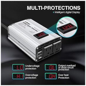 Fornece alimentação contínua de CC a CA de 300 Watts e energia instantânea de 600 Watts, com 2 tomadas CA e 2 portas USB Carregamento inteligente o inversor de energia é projetado com 2 portas de carregamento USB inteligentes, detecta automaticamente seus dispositivos para fornecer a velocidade de carregamento mais rápida até 2,ères por porta, 4,ères máx. Totalmente proteções de segurança Sobre tensão, Baixa tensão, Sobrecarga, Curto circuito, Sobreaquecimento, Proteção contra inversão de polaridade fusível. Tecnologia de partida suave, função de reinicialização automática A carcaça durável em liga de alumínio fornece proteção avançada contra quedas e batidas. O ventilador de refrigeração inteligente integrado ajuda a reduzir o calor e evita a escassez. Projeto isolado de entrada , saída. Ventilador de refrigeração de controle térmico de alta velocidade Marca: Não Informado