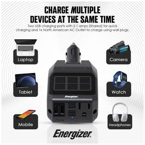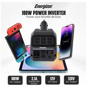 INVERSOR ENERGIZER 100W Inversor contínuo de 100 W CC , CA, com quatro portas de carregamento multiuso Dissipador de calor de cobre nos permite construir um inversor sem ventilador de 100 watts com alto pico de 200 Watts Sem fios, sem cabos, sem problemas Cabeça rotativa de 12 volts para girar e manter em qualquer direção. QUATRO PORTAS DE CARREGAMENTO Porta de carregamento USB dupla 2.1A compartilhada e tomadas de CA dupla para carregar dispositivos maiores ENERGIZER MANTÊ LO INDO testado, validado e aprovado pelo ETL por sua segurança e desempenho. ETL aprovado sob UL STD 458 e CSA std C22.2 Marca: Não Informado