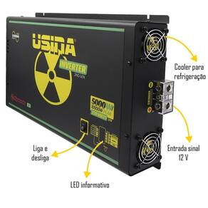 Inversor De Tensão Senoidal Usina Inverter 5000W 24 Volts 220V Descrição: Foi desenvolvida para suprir a necessidade do mercado de um inversor de qualidade com saída senoidal pura, que fosse desenvolvido e fabricado no brasil. O inversor usina utiliza o que há de melhor em tecnologia, seu microcontrolador monitora todo o funcionamento garantindo uma tensão de saída estável e limpa, mesmo com grandes variações na carga conectada em sua saída e variações na tensão de alimentação.