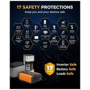 Proteção total Fusível de deslizamento de 35A integrado, Display digital inteligente, 2 Ventilador de resfriamento, Alarme sonoro, proteção de desligamento automático contra sobretensão, baixa tensão, sobrecarga, curto circuito, superaquecimento