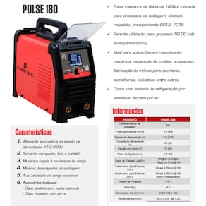 – Fonte Inversora de Solda de 180A e´ indicada para processos de soldagem: eletrodo revestido, principalmente 6013, 7018.