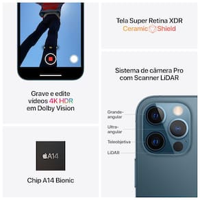 iPhone 12 Pro. Tela Super Retina XDR brilhante de 6.1 polegadas*. Ceramic Shield, que é quatro vezes mais resistente a quedas**. Fotos surpreendentes em pouca luz com o novo sistema de câmera Pro e alcance de zoom óptico de 4x. Reprodução, edição e gravação de vídeos em Dolby Vision com qualidade de cinema. Retratos com modo Noite e experiências ainda melhores em realidade aumentada com o Scanner LiDAR. Poderoso chip A14 Bionic. Compatível com 5G***. E novos acessórios MagSafe com encaixe fácil e recarga sem fio mais rápida****. As possibilidades são espetaculares e infinitas.