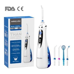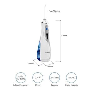 O V400 Plus é a versão renovada do famoso irrigador dentário líder em limpeza oral Water Pulse. Seu design estilizado o torna ainda mais eficiente e ergonômico. Ótima qualidade de construção para uso diário, resistente a respingos durante o uso na pia. * Gengivas saudáveis e dentes mais brilhantes em apenas um minuto por dia! Novo sistema de carregamento rápido Indicador LED de bateria de 3 níveis Controle de pressão de água Rotação de 360 graus do bico 4 bicos diferentes, recipiente com capacidade de até 240 ml.* O Water Pulse V400Plus é seu aliado perfeito para limpeza bucal, ideal para uso diário e pessoas tratadas com ortodontia.* Dica: o irrigador dentário não substitui a escova de dentes ou o fio dental.\ NDados técnicos: Modelo: V400 PlusVoltagem: 100-240 VBateria de lítio/uso sem fio (carregado por cabo de alimentação). Frequência: 50-60 HZ Pressão da água: 70-110 psiFFrequência: 130-160/ ms Frequência variável\ nPuxos: 11400 puxões por minuto\ nModo: Modo de 3 níveis para alterar a pressão da água