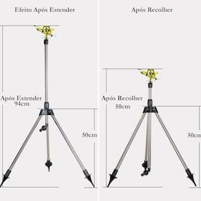 Irrigador telescópico com tripé, que permite a livre movimentação e regulagem de altura.