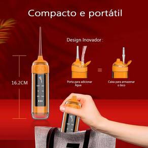 Irrigador oral removedor tartaro water flosser 6 modos Características do produto Tipo de alimentação: usb Capacidade de água: 180 ml É sem fio: sim Cor: laranja Pressão máxima: 40- 140 psi Quantidade de bicos: 4 Quantidade de níveis : 6 É à prova d'água: sim Marca: water flosser Modelo: irrigador oral sem fio Acessórios incluídosPonta raspadora de língua, ponta , ponta periodontal, ponta padrão. Peso e dimensões Largura4 cm Profundidade6 cm Altura17 cm Irrigador oral removedor tartaro water flosser 6 modos Transforme sua rotina de higienização bucal com o irrigador oral. O aparelho oferece cuidado profundo e limpeza excepcional dos dentes, removendo placa bacteriana e alimentos entre os dentes e abaixo da linha da gengiva, alcançando locais onde a escova e o fio dental não chegam. Ideal para quem usa , implantes, pontes, coroas e próteses. Dispõe de seis níveis de intensidade, permitindo escolher conforme sua preferência. Possui um reservatório de água e acompanha quatro tipos de bicos: ponta raspadora de língua, ponta , ponta periodontal e ponta padrão, além de uma ponta padrão adicional. Portátil, leve e fácil de transportar. À prova d'água e com baixo ruído de funcionamento. Benefícios: - rotina de higiene bucal mais saudável; - remoção de placa bacteriana em locais de difícil acesso; - estímulo da circulação sanguínea na região bucal; - higienização otimizada para usuários de , implantes, pontes, coroas e próteses; - ideal para quem sofre com retração gengival; - limpeza precisa e delicada. Instruções de uso: - carregue o produto por 5 horas antes do primeiro uso; - preencha o reservatório com água; - escolha e insira o bico desejado até ouvir o clique; - posicione o aparelho a um ângulo de 90º em relação à linha da gengiva; - pressione o botão de ligar para iniciar a higienização; - após o uso, desligue o dispositivo e remova o bico pressionando o botão de ejeção; - limpe o bico utilizado, esvazie a água do reservatório e guarde o aparelho em local seco e limpo. Características gerais: - bateria com duração de até 70 minutos; - à prova d'água; - pressão de água 40 a 110 psi ; - proteção de água ipx7; Características técnicas de bateria: - duração da bateria varia conforme o nível selecionado 30 a 60 minutos ; - tempo de carregamento: de 3 a 5 horas. Botões e visor: - dois botões: liga/desliga e seleção . - visor com indicação dos níveis de intensidade e luz indicativa de carga; - orifício superior para encaixe dos bicos; - entrada para cabo usb. Ficha técnica: - modelo: l 13 - capacidade do reservatório: 180 ml - pressão da água: 40-140 psi - classificação à prova d'água: ipx7 - dimensões: 17 x 6 x 4cm - peso: 0,28 kg - alimentação: usb bivolt - tempo de carregamento: de 3 a 5 horas - duração de bateria: de 30 a 60 minutos Contém: - 4 pontas: 1 pontas de jato padrão , 1 ponta de limpeza de língua, 1 ponta e 1 ponta periodontal; - 1 cabo usb - 1 saco portátil Marca: Não Informado