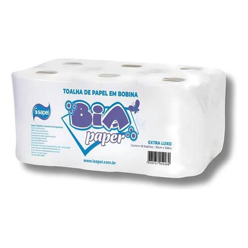 Especificações técnicas Papel modelo: papel toalha em bobina Tipo de papel: extra luxo - fibras celulósicas: material feito com a apara que sobra na produção do papel de celulose virgem . Alvura: 90% branco Peso: +/- 3,800grs por fardo Quantidade: 6 rolos de 200 metros. Marca: isapel Dimensões: rolo com 20 centímetros Marca: Não Informado Ean: 79004511240009