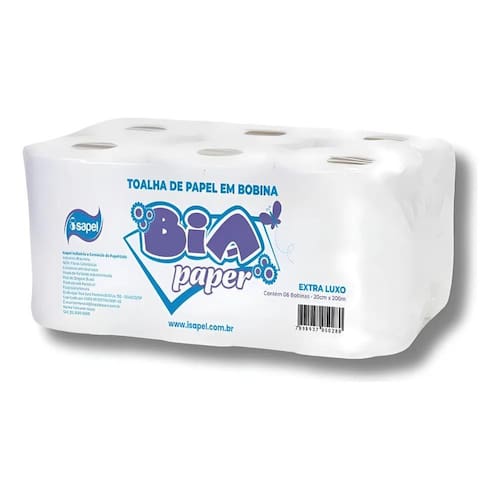 Especificações técnicas Papel modelo: papel toalha em bobina Tipo de papel: extra luxo - fibras celulósicas: material feito com a apara que sobra na produção do papel de celulose virgem . Alvura: 90% branco Peso: +/- 3,800grs por fardo Quantidade: 6 rolos de 200 metros. Marca: isapel Dimensões: rolo com 20 centímetros Marca: Não Informado Ean: 79004550146140