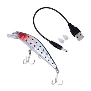 Recursos: Tem luz LED piscando e pode vibrar para atrair peixes grandes. Ação de mergulho suave e rápido. A isca recarregável pode ser carregada em minutos através da porta USB. Adequado para água fresca e salgada.