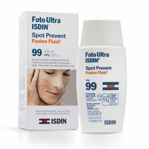 Foto ultra isdin spot prevent fusion fluid fps 99 50ml previne manchas causadas pela exposição solar. Muito alta proteção uvb fps 99 e uva in vitro 61 . Indicações muito alta proteção diária que se funde com a pele. Ajuda a prevenir alterações na pigmentação devido a exposição solar. Ideal para todo tipo de pele. Benefícios muito alta proteção uvb fps 99 e uva in vitro 61 . Sua textura fusion fluid se funde com a pele, ideal para ser utilizado antes da maquiagem. Não comedogênico. Não acnegênico. Dermatologicamente testado. Hipoalergênico. Resistente à água. Ideal para peles normais a secas. Modo de usar aplicar abundantemente sobre a pele seca, meia hora antes da exposição ao sol. Aplicar 2mg/cm² do produto, ao reduzir essa dose, o fator de proteção é reduzido. Reaplicar a cada 2 horas ou se transpirar, nadar ou secar-se com a toalha e durante a exposição ao sol. Reg. Ms. 155/98 Ean: 8429420079717