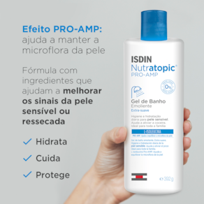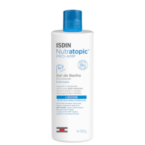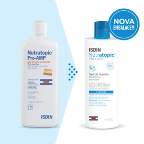 Gel de banho para peles reativas ou sensíveis. ISDIN Nutratopic Pro-Amp limpa a pele de forma suave, evitando o ressecamento e a agressão associados à higiene da pele reativa.