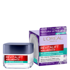 Gel creme para peles mistas a oleosas. L’oréal Paris Revitalift Hialurônico possui dupla ação anti-idade e antioleosidade, hidratando e reduzindo os poros.