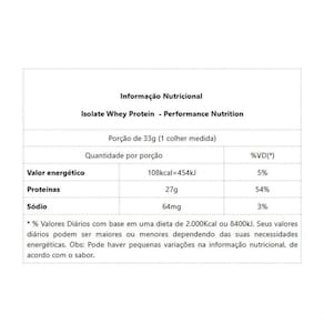 Isolate Whey Protein (2kg) - Sabor: Chocolate (1,8kg) Isolate Whey Protein (2.000Kg) - Performance Nutrition Isolate Whey Protein é um Whey de proteína isolada de filtragem Ion Exchange(troca iônica), sendo 0g de Carboidratos e não contém LACTOSE por se tratar de uma proteína de alto valor biológico, adoçado com STEVIA. 27g de Proteína por porção: Fornece 98% de absorção pelo organismo. Não contém outro tipo de Whey Protein, é 100% Whey Protein Isolado. 15g de Aminoácidos essenciais sendo 7g de BCAA's (Aminoácidos de Cadeia Ramificada): por uma ocorrência natural desta proteína de alto valor biológico. Benefícios: - Proteína 100% isolada;- Auxilia no aumento da massa muscular;- 27g de Proteínas por porção;- 7g de BCAA por dose;- 0g de Carboidratos.
