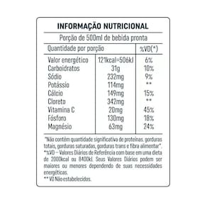 Bebida Isotônica para a reposição de sais minerais. Depois de misturado e consumido, ele agiliza a hidratação do nosso corpo Por ter a mesma osmolalidade do sangue ele é facilmente recebido pelo nosso sangue, a reposição de sais minerais, Carboidratos e água são instantâneas em nosso organismo. Formula 232mg de Sódio 114mg de Potássio 149mg de Cálcio BENEFÍCIOS: Mantem a quantidade exata de água no sangue É ótimo para combater as câimbras de atletas de alta performance e de final de semana Melhor anti ressaca já inventado Ean: 7891454346409
