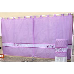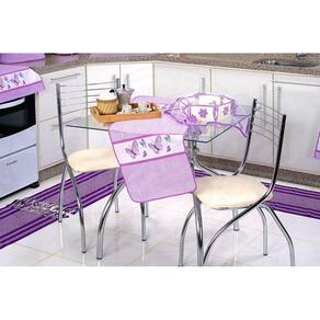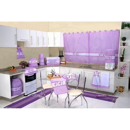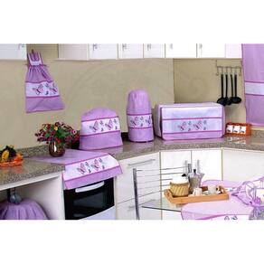 Itens de cozinha fabricados com tecido xadrez, na cor branco e lilás, barrado bordado em ponto cruz e detalhe no meio com lindas borboletas em liilás, branco e verde, acabamento em viés lilás.
