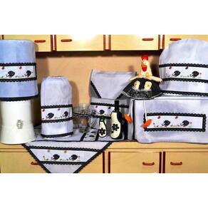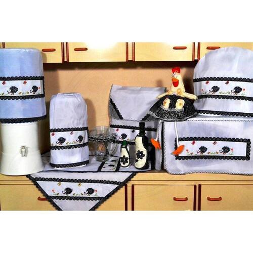 Itens de cozinha fabricados com tecido tergal, com a cor de fundo branca, barrado bordado em ponto cruz e detalhe no meio com meigas galinhas D'Angola em preto e branco e acabamento em lesie preta com bolinhas brancas.